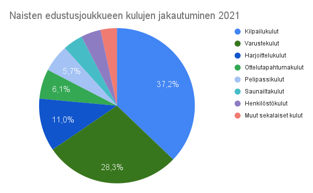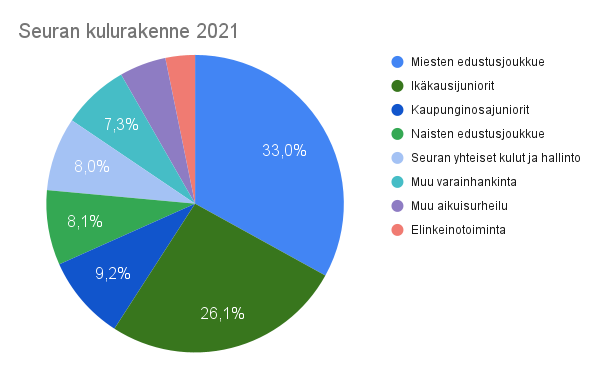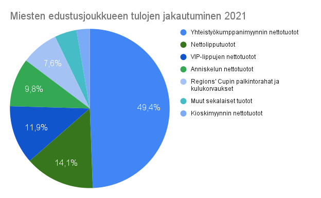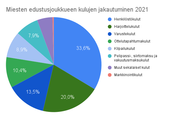 Kun tarkastellaan seuran kuluja osa-alueittain, miesten edustusjoukkueen varsinaisen toiminnan kulut ovat selvästi suurin menoerä eli 82 603,11 euroa. Kun mukaan otetaan varainhankinnan kulut, ovat miesten edustusjoukkueen päättyneen tilikauden kokonaismenot 92 366,46 euroa. Verrattuna edellisen tilikauden lukemiin kasvua on maltillisesti noin 3 000 euroa, mikä kuvastaa hyvin sitä, että kaudella 2021 edustusjoukkueen toiminta oli hyvin samankaltaista kuin edellisellä kaudella. Kulujen kasvu liittyi siihen, että Suomen Regions’ Cupin menestyksen myötä otteluita oli enemmän, jolloin matkakulut ja järjestyksenvalvonnan kulut nousivat.