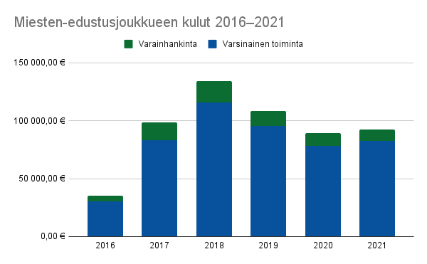 - Miesten edustusjoukkueen menot 92 366,46 € (sisältää varainhankinnan menot)