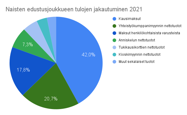 Toisaalta ottelutapahtumista saatiin mukavat 2 760,00 euron tulot ja yhteistyökumppanuuksista saatiin 4 380,00 euron tulot. Lisäksi tukikausikorttien myynti tuotti 1 020,00 euroa. Varainhankintaan panostamisen ansiosta kausimaksujen nousu saatiin pidettyä pienehkönä: kaudella 2020 kausimaksuilla kerättiin 5 543,70 euroa ja kaudella 2021 kerättiin 7 938,32 euroa. Tähän vaikutti osaltaan myös se, että naisten edustusjoukkueelle ohjattiin seuran hallinnon varoja budjetoidun mukaisesti 2 000 euroa, eli käytännössä naisten edustusjoukkueen tuloksen sallittiin olla 2 000 euroa alijäämäinen.