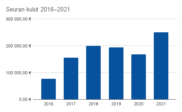 Yksi tapa tarkastella seuran kokoa on seuran kokonaismenot, jotka olivat päättyneellä 250 151,11 euroa. Kasvua edellisvuodesta on reippaasti, sillä tilikauden 2020 kokonaismenot olivat 168 378,10 euroa. Muutos selittyy erityisesti junioritoiminnan kasvulla ja naisten edustusjoukkueen sarjanousun tuomilla lisäkustannuksilla, mutta kulut ovat kasvaneet toiminnan kehittymisen myötä hivenen kautta linjan.