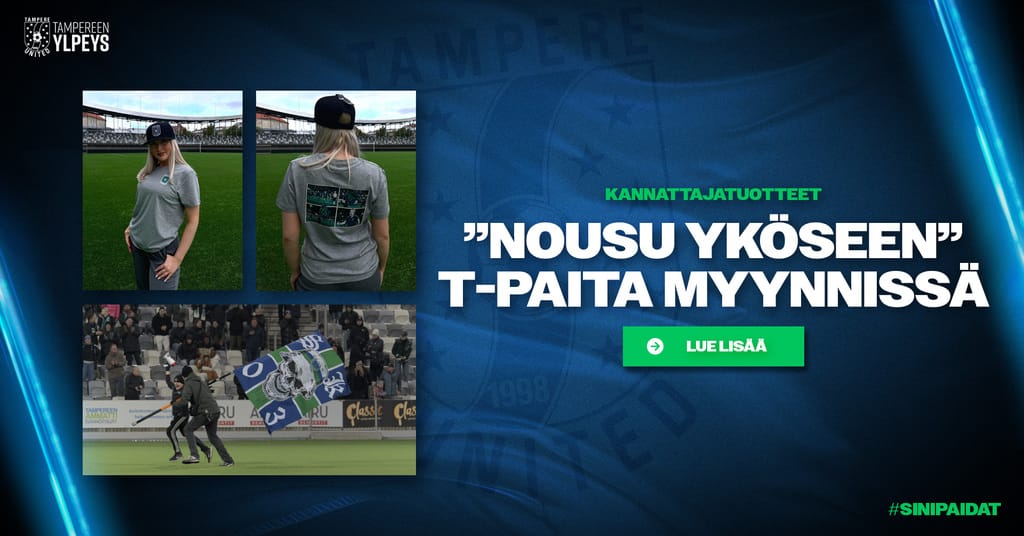 Sinivihreä seurayhteisö juhli reilu vuosi sitten nousua miesten Ykköseen. Nousuhetkeä juhlistava t-paita tuli myyntiin ottelutapahtumissa syyskesällä, ja nyt sen voi ostaa myös TamU-kaupasta. Harmaan t-paidan etupuolella on Tampere Unitedin logo ja takana neljä kuvaa hetkestä, jolloin nousu Ykköseen oli juuri ratkennut Tammelan stadionilla 20.10.2024. Paidan hinta on TamU-kaupassa 21,90 €. Tule ostoksille!